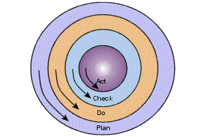 A model therefore needs to recognise these different elements, and the different speeds at which they may cycle, and therefore a model utilising a number of concentric rings provides the simplest and most suitable model. The example shown below is for a PDCA cycle, but may be equally applied to any other process.
